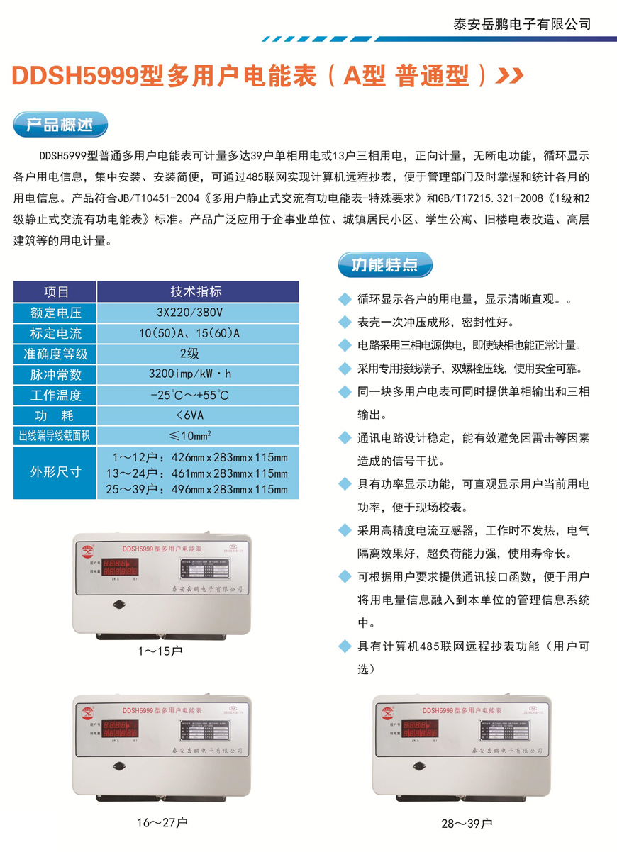 DDSH5999型多用戶電能表是采用微電子技術(shù)和表面焊接工藝生產(chǎn)的智能產(chǎn)品,可計(jì)量多達(dá)39戶單相用電或13戶三相用電,產(chǎn)品采用單片機(jī)處理系統(tǒng)實(shí)現(xiàn)數(shù)據(jù)檢測(cè),分戶計(jì)量與顯示,體積小、抗電磁干擾、功耗低、使用壽命長(zhǎng)、智能抄表等優(yōu)點(diǎn)。該類型電能表正向計(jì)量,無(wú)斷電功能,循環(huán)顯示各戶的用電信息,集中安裝、安裝簡(jiǎn)便,主要用于新建樓房、舊樓改造、學(xué)生公寓等用電計(jì)量。該產(chǎn)品符合JB/T10451-2004和GB/T17215.321-2008標(biāo)準(zhǔn)。